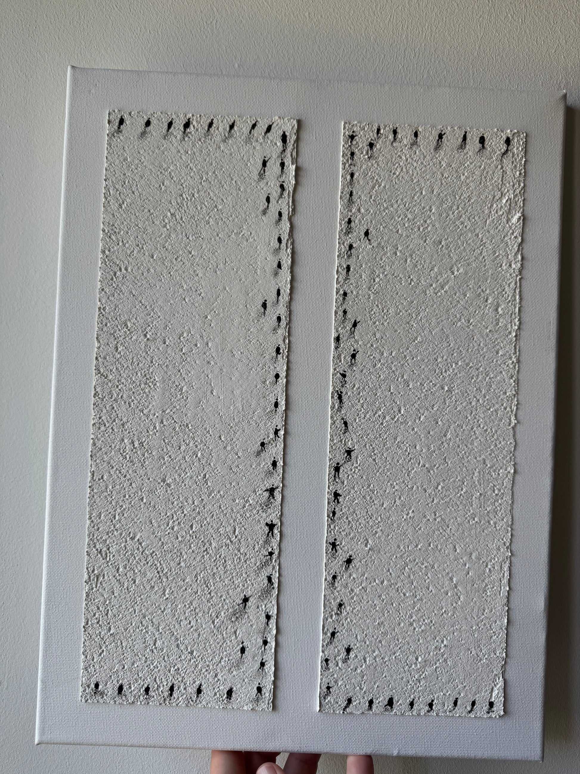 This artwork features two vertical, textured panels side by side, each with a rough, monochromatic surface in shades of off-white or cream. The edges of both panels are bordered by small black humans, providing contrast and drawing attention to the boundaries of each section. The composition’s minimalist and symmetrical nature evokes themes of balance, order, and repetition, while the tactile surfaces invite closer inspection.