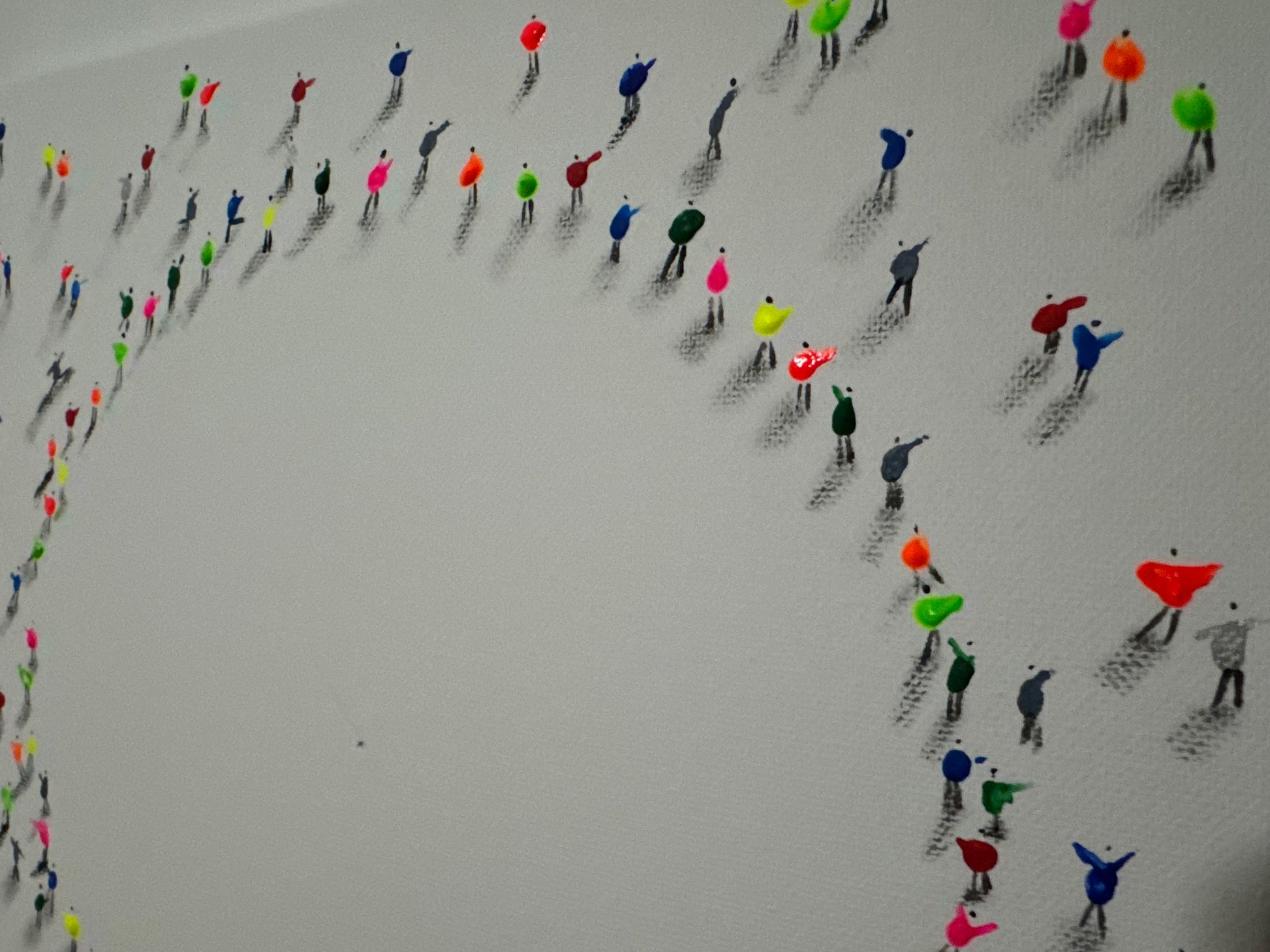 A ring of fluorescent, abstract figures gathers around an empty center, their long shadows stretching inward like converging paths. The small acrylic silhouettes suggest a crowd in constant motion, transforming the white 30x30 cm canvas into an orbit of shared energy and possibility.